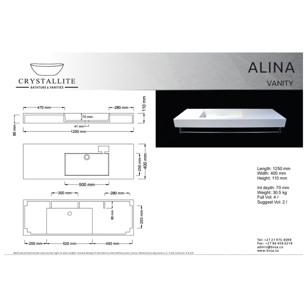 Description: The Alina 1.25m - left or right bowl with towel rail (wall mount only) by Crystallite offers a perfect blend of style, function, and innovation. Made from high-quality composite materials, this piece adds elegance to any space while ensuring long-lasting performance.